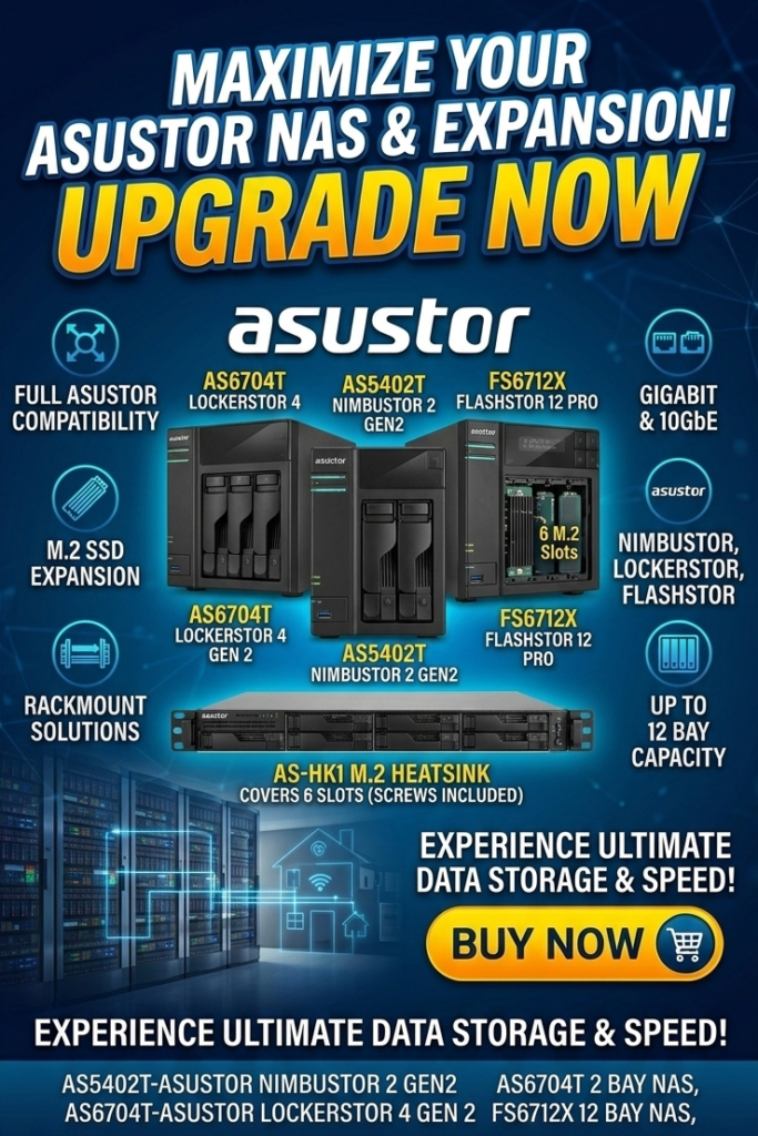 Asustor Flashstor 6 FS6706T – 6 Bay NAS Storage, Quad Core 2.0GHz, Six M.2 SSD Slots, Dual 2.5GbE Ports, 4GB RAM DDR4, Computer Network Attached Storage (Diskless)